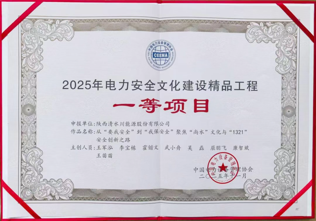 11月14日,從中國電力設備管理協會傳來捷報,清水川能源申報的《從“要我安全”到“我保安全”聚焦“尚水”文化與“1321”安全創新之路》電力安全文化建設項目,在2025年全國電力安全文化精品工程評選中脫穎而出,斬獲一等獎殊榮。