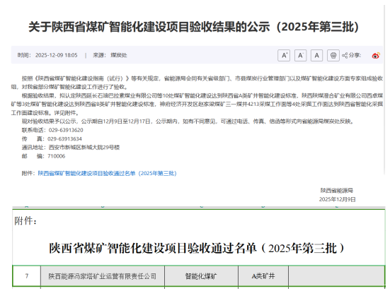 近日,陜西省能源局公布了關于陜西省煤礦智能化建設項目驗收結果的公示(2025年第三批),陜西能源馮家塔礦業運營有限責任公司位列其中。