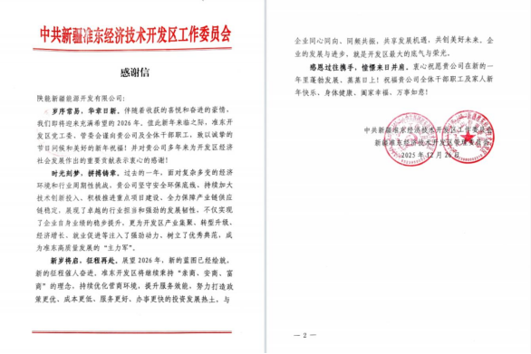 12月30日,陜能新疆收到來自準(zhǔn)東經(jīng)濟(jì)技術(shù)開發(fā)區(qū)黨工委、管委會(huì)的感謝信。信中對(duì)公司長期以來為開發(fā)區(qū)經(jīng)濟(jì)社會(huì)發(fā)展所作出的重要貢獻(xiàn)表示衷心感謝,并對(duì)在過去一年中展現(xiàn)的國企責(zé)任擔(dān)當(dāng)與發(fā)展韌性給予高度肯定。